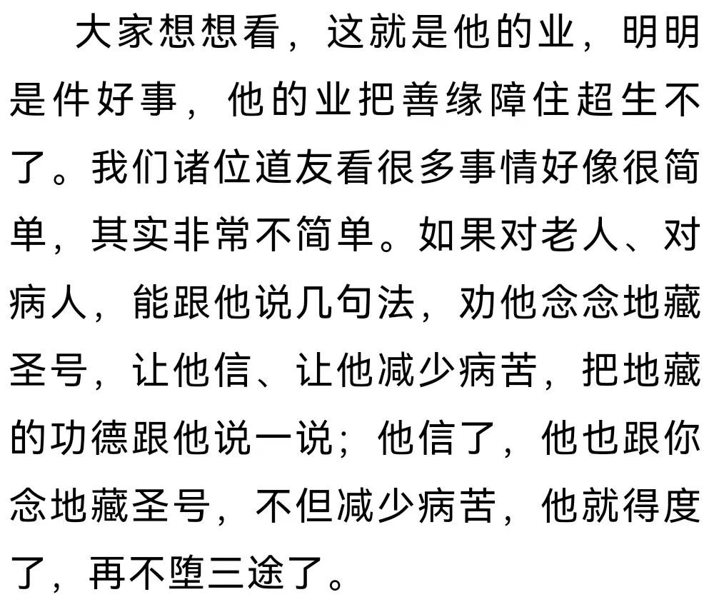 菩萨行布施度的时候,是以法施为重,以法布施为最上等。大家都读过《普贤行愿品》,你累积多少世间财宝,都不如你对他说几句法,给他念几句佛号让他能得度。我在北京的时候,法源寺有位老师父,他自己也有个小房,还不是小庙。那时不许有小庙,他自己住着,还有几间房子,都是他自己的。他看见一个老太太带着小孙子在街上讨口,他感觉很可怜。那时我在法源寺中国佛学院教书,他住在常住,他一个人住三、四间房子很宽的,想把那两祖孙收下来。他跟老太太商量:“老太太啊!你让小孙子跟我出家,你可以到我那住,不要在街上讨口了,我可以养活你们,你可以照顾他。”这老太太瞪他一眼说:“我们讨口够倒霉,还跟你去当和尚!”我跟这道友说:“你后来有没有再说什么?”他说:“我就没有再说什么,赶紧走开了。我怕出问题,就走开了。”