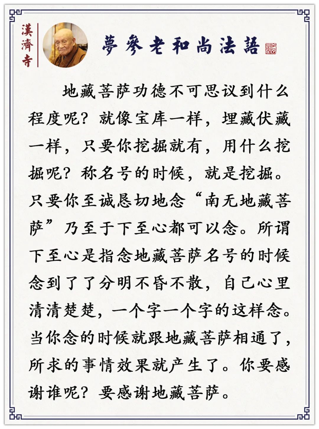 《地藏经》教我们念的是你随着经念,念这一尊佛的名号,就销了多少劫重罪。不是专念、而是随着经文念的时候,就会念到这些佛的名号。因为地藏王菩萨感觉到这个世界的众生很难度,让他一下成佛办不到,怎么办呢?称佛名号一定能成佛,现在成不了佛,因种下去了,你称哪个佛名号,哪个佛就跟他结上缘了,就是这个意思,他一定摄受你,使你成佛。前面说了很多的利益、很多的好处,但不是究竟的,地藏菩萨的愿是度一切众生都成佛,地狱三途都让他们究竟成佛,所以要称佛名号。