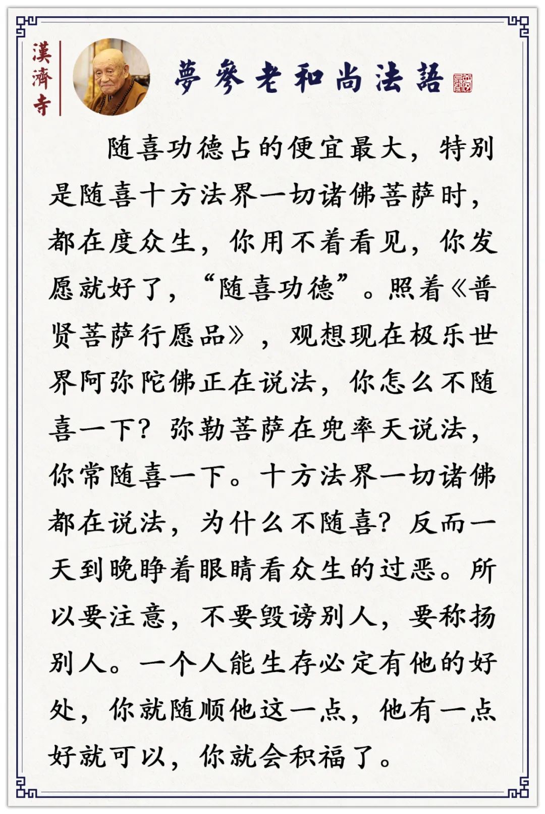 “随喜功德”,随喜一切众生、随喜一切诸佛菩萨,愿一切众生舍离嫉妒障碍,看见人家有一点善事、有一点进步、对三宝有功德,都应当赞叹随喜。若师长对某同学、师兄弟表扬了一句,你就生起嫉妒心,说:“有些事我也会做,我比他还强,他有什么了不起的。”不但不随喜人家,反而说上几句不好的话。如供千僧斋做佛事的,有的师父说说笑笑,也没威仪,看上去一点也不庄重,我说:“莫生分别心,文殊菩萨在,可能是文殊菩萨示现的,你欢欢喜喜赞叹,不要从现象上迷惑了我们智慧的眼睛。”所以随喜功德,是增长自己功德最便宜的事,大家不要轻易地放弃,而且随喜功德可以对治你嫉妒、障碍、烦恼。所以不论一切时、一切处,一切圣凡的功德悉皆随喜,这个功德就可以使你成佛。 我们修行要不贪恋执著,要把闻法、修学、行持的功德回向给一切众生,同等获利。所以随便你在哪儿修行、做事,乃至你在寝室看书、诵经,把自己所修这一切的功德都回向给众生,愿众生都能得到真正的利益,大家能一同趋向佛的智慧,到达不生不灭的涅槃城。普贤十大愿王不可思议,文殊菩萨的十大愿我们更应该随喜赞叹,应当把它作为我们的日课。但不能读读就算了,要学文殊菩萨是怎样度众生的。还有《华严经》第四品觉林菩萨赞叹释迦牟尼佛的话,我们也应当每天念一念。 学法要学会用心,闻、思、修三慧缺一不可。只是听听这个,善根是很浅薄的。我们闻之后要思惟,觉得这个法殊胜,照着去做,至于做多做少,随你的力量,主要看你是如何用心的。 若供养一千块、一万块钱,不知发愿回向,还不如供养十块钱又发愿、又回向的功德大,因心力猛烈故。诸位道友,你们在大寮行堂做饭,或做其它事,是否想到以此事去修供养、发愿、随喜、回向?想到与没想到这两者的功德是有很大悬殊的。所以我们不论做什么,都要观想到普贤菩萨的十大愿——“礼敬诸佛”乃至“普皆回向”,一事具十愿,这功德是不可思议的。我们学法就要善于用心,会用心无一事不是佛法,不是行的菩萨道、成就佛果的因。