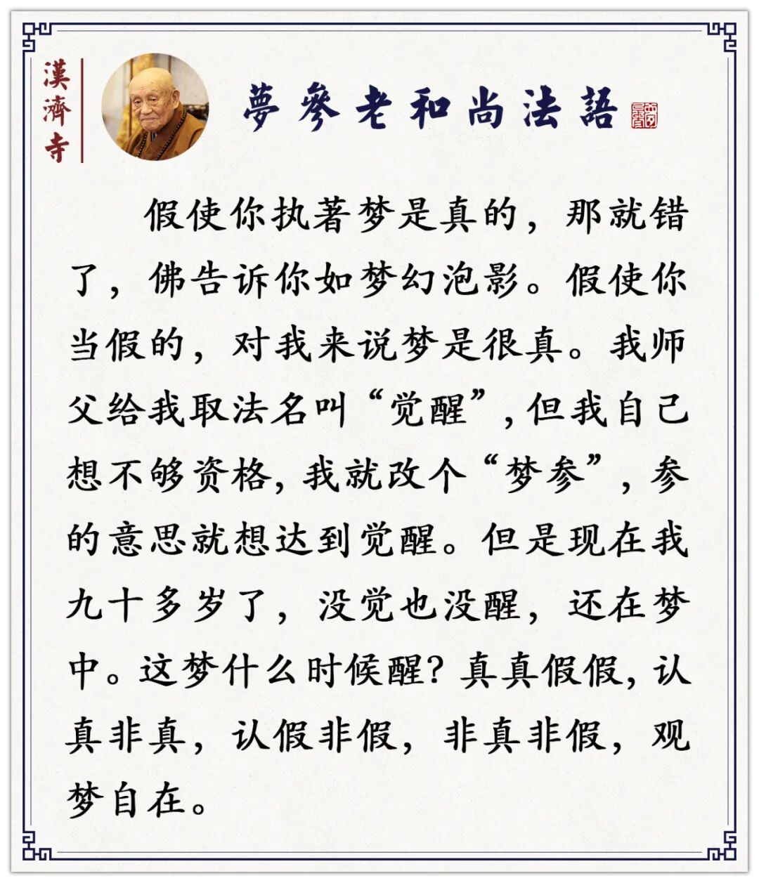例如我进监狱,大概前两百天就预感到不祥,梦中本来让我不要往东走,要往西走。我在拉萨,往西走可以到印度去了,不要回去。谁相信梦?我们都不相信梦,我的名字叫梦参。我过去很相信梦,有些时候不相信梦。为什么?业障发现就不相信了。相信了,这个业就躲过去,祸就躲过去,是福不是祸,要是祸,你躲也躲不过。你说躲得了?业障来了,任何人都躲不了。一切人跟人之间的冤业、是非、人我,你说我躲脱了,躲不了。