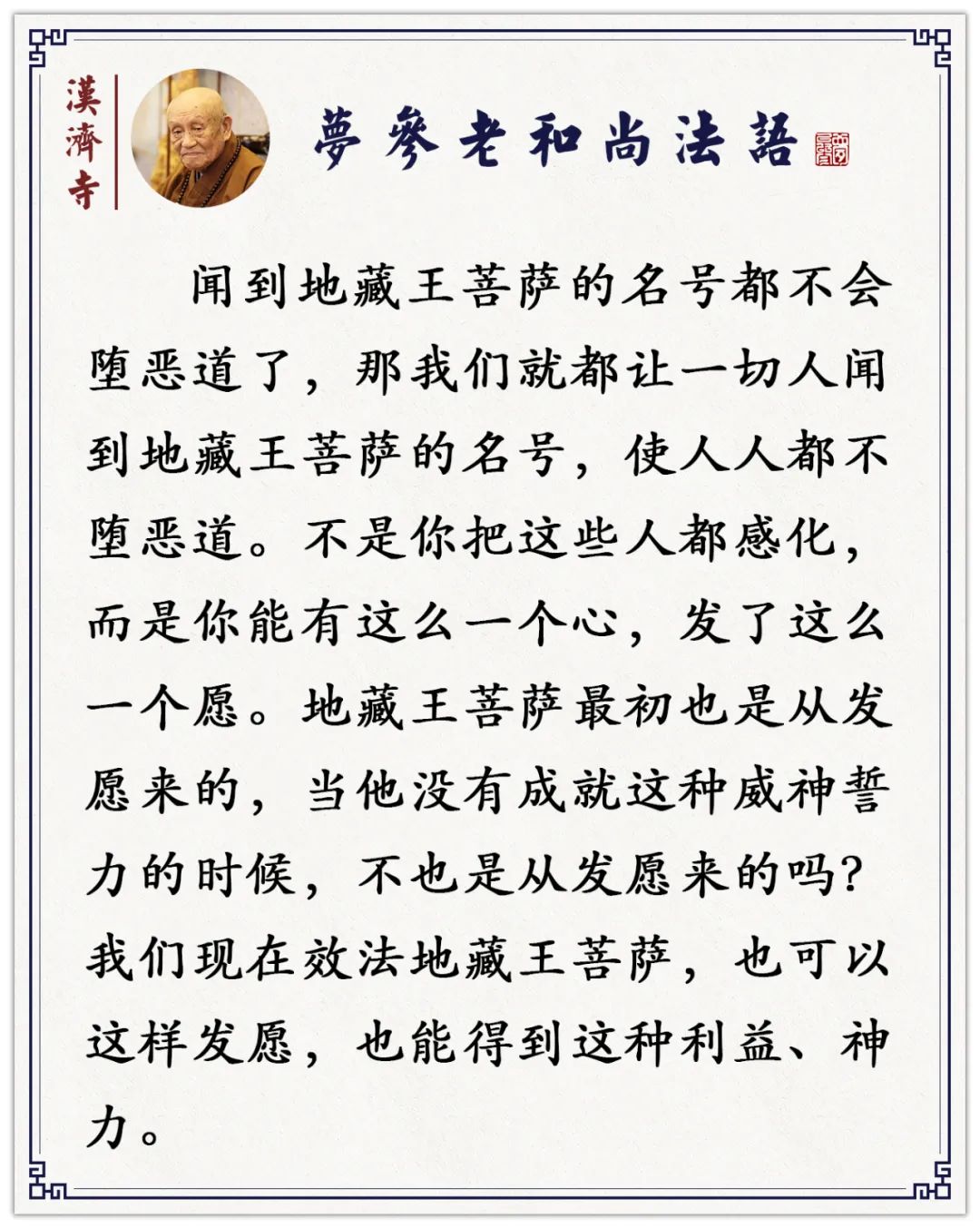 【是故普广。当知地藏菩萨有如是等不可说百千万亿大威神力利益之事。阎浮众生。于此大士有大因缘。】普广菩萨请佛说地藏王菩萨的功德,为什么地藏王菩萨有这些威神力呢?因为我们跟他有缘,不然他的威神力没有用,没缘的他还没有办法。但也不是这个洲的每个人都跟他有缘,我看有缘的还是不多。为什么这样说呢?因为如果有缘的多的话,我们这个世界不会有这么多的灾难,刀、兵、水、饥馑,什么灾难都有。不要用凡情来看这些问题,一定要用圣境来观这些问题。大家要在一切处、一切时发愿,好比坐公共汽车、坐飞机、坐火车,凡是众多人的地方,你就发愿,愿你们将来都做佛的弟子。“南无地藏王菩萨”、“南无阿弥陀佛”,要佛力加持他们,把他们都度了,你就是大菩萨了。这个因缘种下去了,会成长的,如果我们开了天眼通、得了宿命通,你能看到这些因缘。这就要信仰力,没有信心是不行的。我说这些话,可能有人信,有人不信,要是看看华严经,就知道这种力量太大了!这是不可思议的力量,这种力量是无形无相的,但这个无形无相的比原子弹的力量多。我并没有把原子弹看得很大,我把一个众生生起恶心看得不得了,他能使我们整个世界颠覆。要发一个恶心、恶愿,就能使整个世界颠覆。不过不是现在,他发了恶愿,还得经过好多世才能酝酿成熟,所以千万不要起恶心,要注重我们现前的一念心。