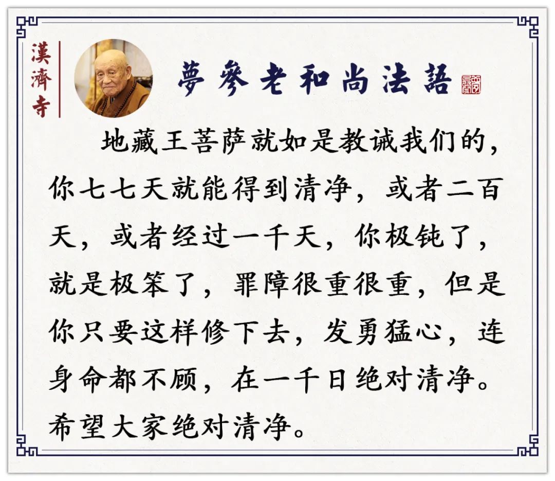 若业障厚、善业薄的,一七日不行,经二七日乃至七七四十九日才能得到清净。若过去、现在恶业增长,得忏悔一百天,乃至一千天才得清净;有的三年也没得到清净。但别生退心,相信地藏菩萨不会不管,地藏菩萨会替你忏悔,给你加持力和增上缘,让你的罪业早日消失。