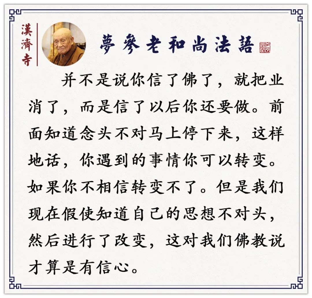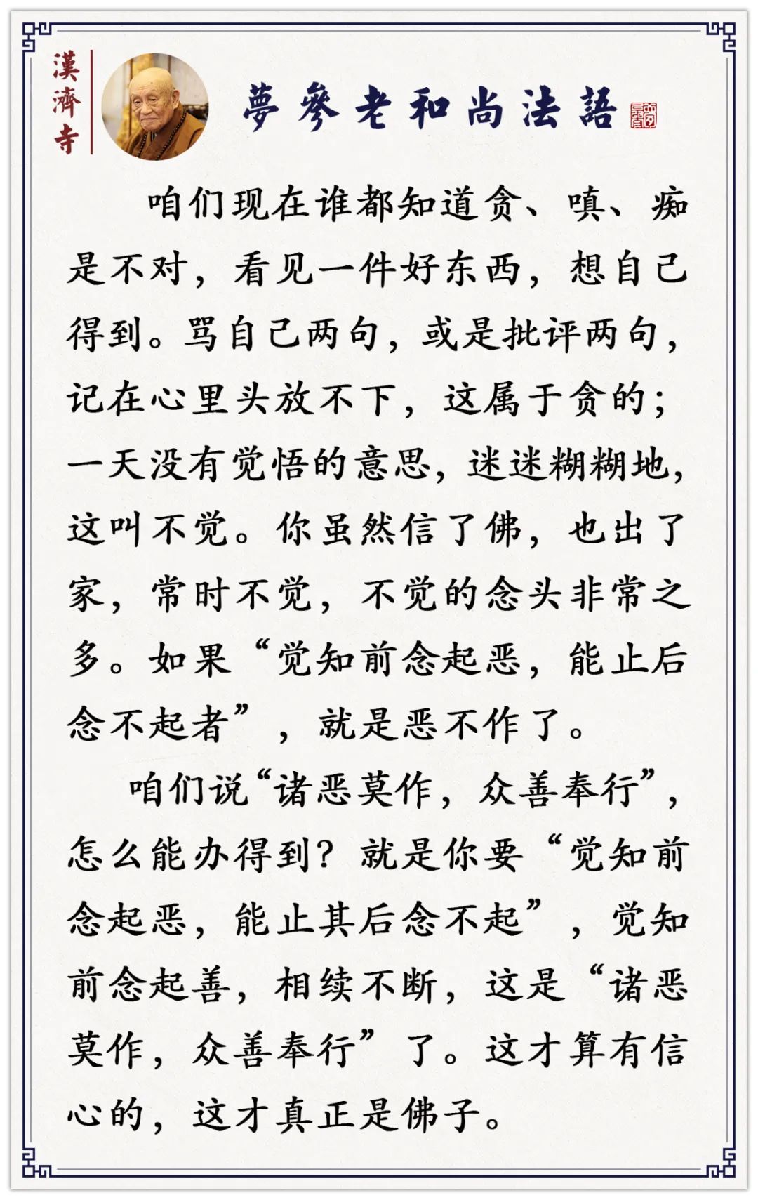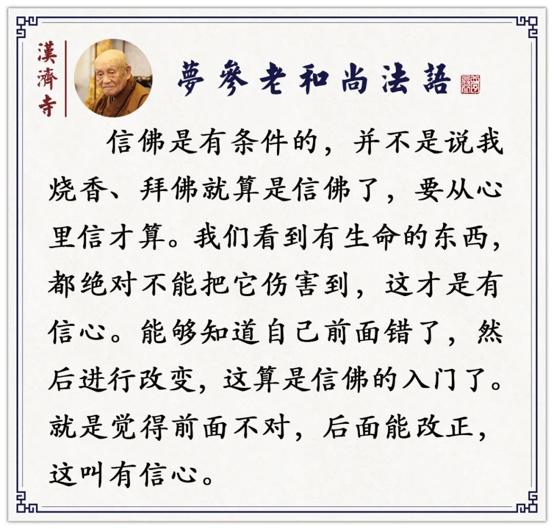 什么样算是信呢 梦参老和尚 我们现在的信佛,只能说是欣乐,不能称上“信”。现在的社会,包括我们出家的道友,真正信佛的很少。我这个要求过高,什么样算是信呢?觉知前念起恶,能止其后念不起者,这算是有信心的。不论比丘、比丘尼,优婆塞、优婆夷。 因此我们就知道了,信佛是有条件的,就看能不能听佛的话。并不是说给佛像磕个头就叫信佛啦,而是看能不能按照佛所教授我们的话去做。佛叫我们不要造恶,我们做到没有?身没有杀、盗、淫,口里没说妄言、绮语,不说假话,心里头没有贪、嗔、痴,这算是听佛的话。 因此,能够做到这样的才叫行十善业。十善业只是人天的因果,我们刚才说有信心,在教理上讲有信心是“觉知前念起恶”,觉得我前一个念头起了恶念,“止其后恶不起者”,绝不让恶念相续。说我念头起错了,赶紧断了,不让这个念头相续,更不要说身体做事实啦,这样才算是有信心的菩萨。 说到“菩萨”两个字,刚才大家看到授三皈,受了三皈就是菩萨,怎么讲呢?“菩萨”是印度话,说全了是“菩提萨埵”,“菩提萨埵”翻中国话就是“觉有情”,能让一切有情都觉悟,就是帮助别人。当你受了三皈,你把你所受的三皈能够介绍给别人,让他们都能够信佛、信法、信僧,这就是菩萨。