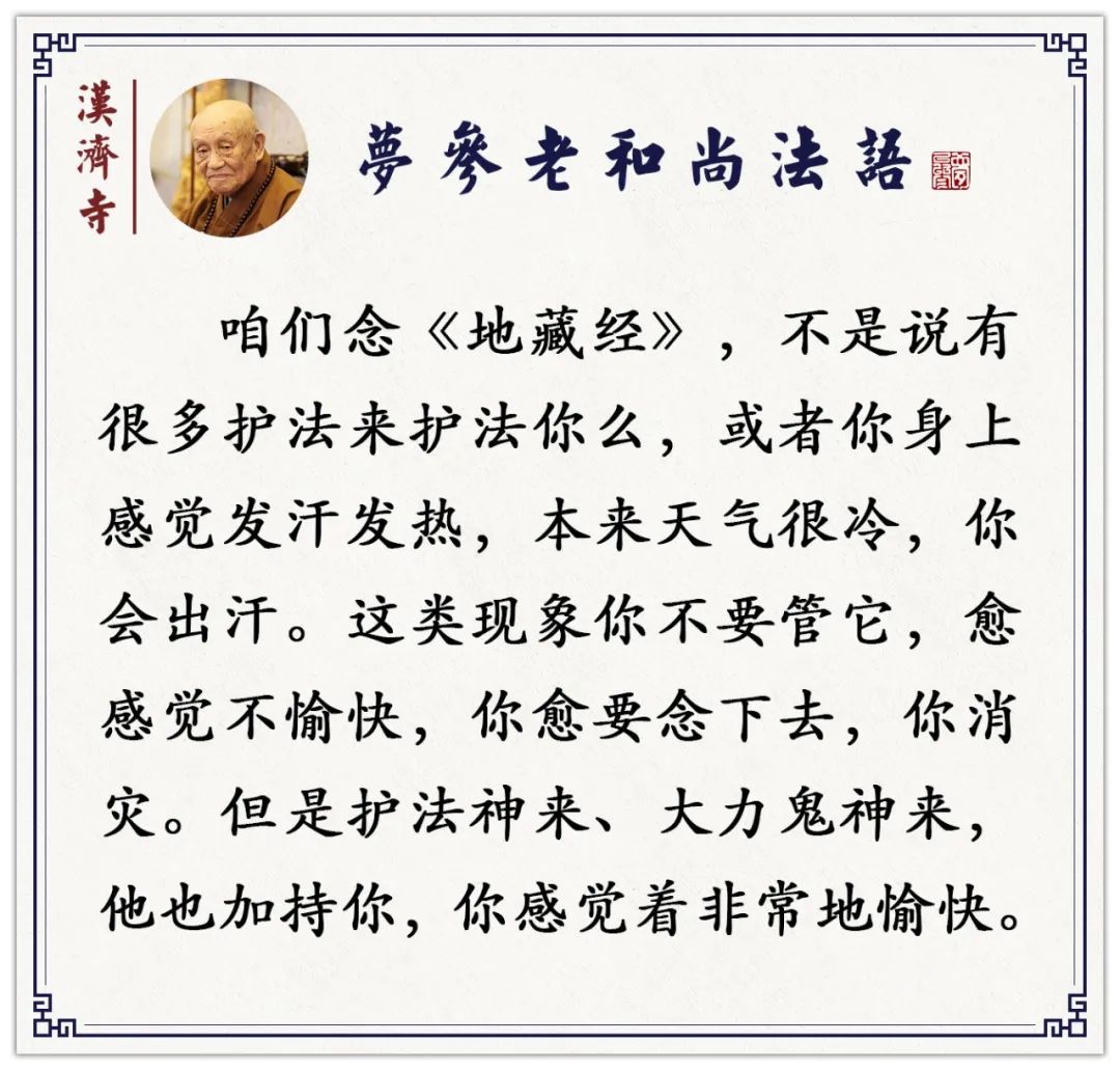 诵经有无量的护法神 到了菩萨位六根清净时候,那你修多少大劫都不容易得到。但是你若是诵《法华经》、读《法华经》,你都得到了。 佛的慈悲含义,让一切众生闻到《法华经》这个名号,那身心毛骨都悚然的,完了是持之不舍,完了再一天天地诵持,你就得到这些功德。诵持就是修行,解说也是修行。行菩萨道嘛,诵持、解说。 假使你在诵《法华经》的时候,你别认为你在这儿坐,一个人都没有。你可不知道鬼神、天龙八部,乃至于初发意的菩萨,你身边天龙八部,人多得很,都在那听你诵《法华经》。这也是解说一种吧。 当你读诵大乘经典的时候,当你修行的时候,你观想、你认为这个法堂里头没有人,就你一个人,那时候有无穷无尽的众生来听你读诵《法华经》,是你肉眼见不到。 见到呢?见到吓得你不敢读了,奇奇怪相,什么都有,所以他不能让你见到。大菩萨能见到,这是额外的——额外的就是经上没有这样说,我加以注解说的。 读任何经,修行时候你观想——不是单独的,你见不到的。你读诵大乘,有的说你受三皈五戒,受五戒就二十五个护法神,你读诵大乘那就多了。 你读诵哪一部经,哪一部经都有无量的护法神。当你读的时候,他们都来了,你看不见。这是附带跟大家讲。当你一念经的时候,你感觉身上发热,本来外头天气并不热,但是你自己感觉发热,那就有大力的鬼神、功德很大的来听你念经,所以他就影响到你。 或者你发寒冷,无缘无故地发寒冷;当你念经的时候心里头打颤、有恐怖感,那不是一般的,那是大菩萨来了,加持你。或是你念经念得非常地殊胜、心里高兴,那你本尊来了,加持你。 你会有很多的感觉,这个附带跟大家解释。这叫“密”,不跟你说。他们叫“密宗”、“密宗”,这叫密,有一半不跟你说,不跟你说你并不知道。 你看我们道友,他一念经时候,人家都没热,他热,他脱衣服。我就告诉他:“你不要脱、不要脱,脱什么脱,这个热一会儿就没有了。”这就是感到他的功德。 梦参老和尚《大乘妙法莲华经》讲记