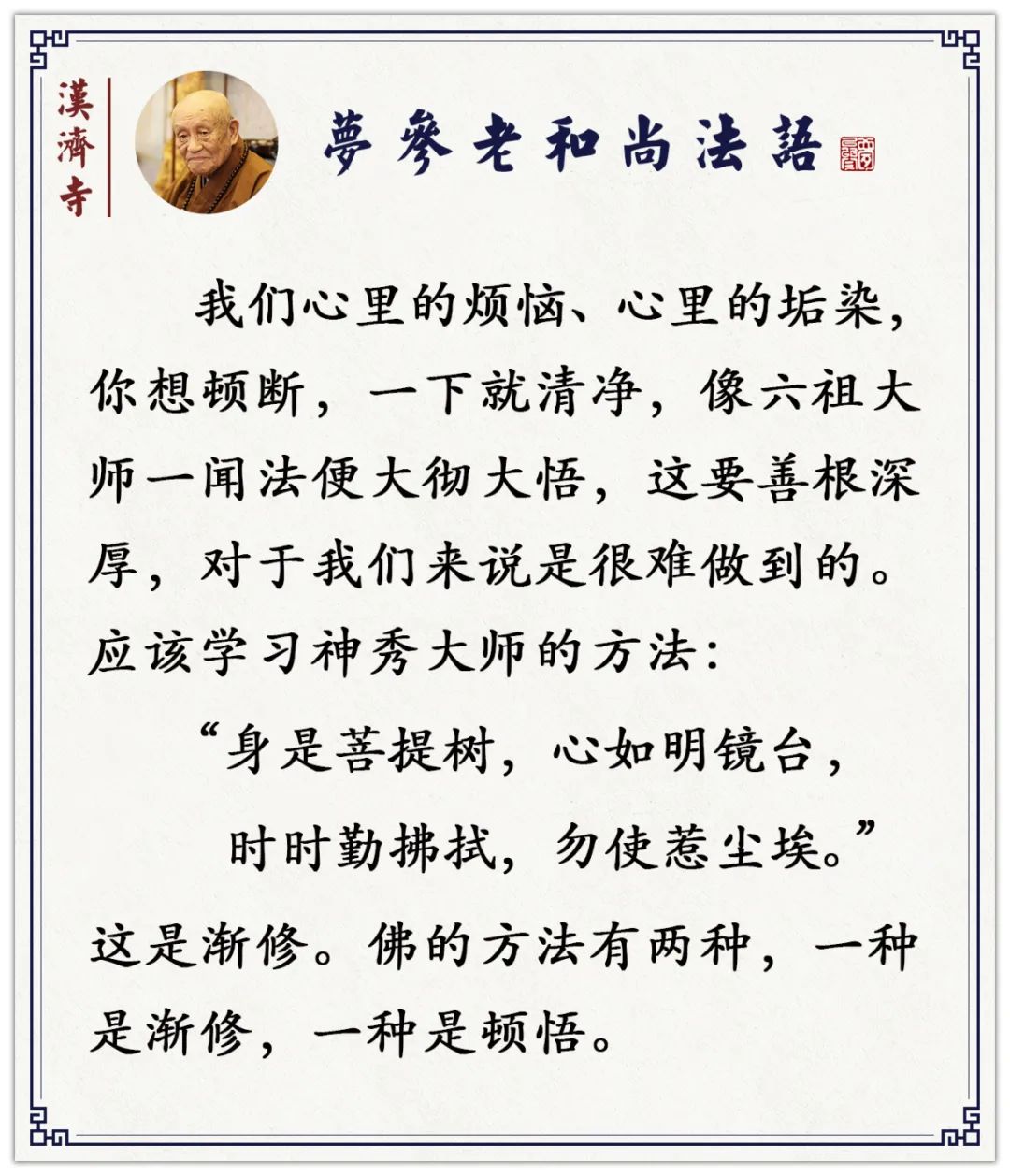六祖参五祖的时候,他有个大师兄叫神秀法师。五祖说你们大家做个偈子,我这祖师位子要退了,我要走了——就是他要圆寂了,要传位给下一代。神秀大师做个偈子:“身是菩提树,心如明镜台。时时勤拂拭,勿使惹尘埃。”他说你这个身相似于菩提,像菩提树一样,菩提就是觉悟了;心是明镜,就是照着你,明镜是智慧的意思——“心如明镜台”,照着这个镜子别做坏事,照了一切。镜子随时要擦才照得见,善恶才分明,不做坏事,尽做好事,常常地把它揩干净——你身口意千万别犯错误,不起杀、盗、淫,不起贪、瞋、痴;“时时勤拂拭”,就是随时修行观照的意思,不让它落到六尘境界去,不要落到生死。五祖赞称他说:做的这个偈子很好,让一切众生不造业,他很快就成佛了。但是六祖大师的偈子,五祖没评论,怕他受害。大家争夺那祖师位——那时候也在争夺,并不是人人都看破放下了。六祖大师怎么做个偈颂?他写的“菩提本非树”,菩提哪里是树,“树”是形容的词;“明镜亦非台”,我们这个心不是什么“台”,用什么台来形容;“原来无一物”,什么都没有,原来就什么都没有,就是咱们讲金刚般若波罗蜜;“何处惹尘埃”,哪里还会落尘境界?这是大彻大悟的。神秀大师教我们从“有门”入手,忏悔业障,礼佛拜忏,“时时勤拂拭”;惠能大师告诉我们开示悟入佛之知见,顿证菩提——这是顿证的,神秀大师是渐修的。“南能北秀”,神秀大师的法就传到北方来,在北方大都是渐修多;南方的大禅堂很多,开悟的人很多——北方是渐修,南方是大悟。但是这个话不是绝对的,南方也有渐修的,北方也有开悟的。但是我们现在是末法,两个都没有了,很少很少的。《金刚经》告诉我们,五百年之后的末法时期还有《金刚经》在,就是说我们诸位,凡是听到《金刚经》的一字一句、乃至一个偈颂,都能种善根,将来都能够得度。这叫有缘则相度,无缘对面碰到了也度不了,佛度有缘人!那我们大家都跟佛有缘,佛都在度;跟《金刚经》有缘,都得《金刚经》度。但是我们成道,这个缘恐怕很难了。读诵没什么困难,希望大家每天能读一遍《金刚经》,种这个善根。善根种下,一定要发菩提芽的,一定能得救的。如果你遇着什么危难了、困难了,不顺心,生活的资源不够,念念《金刚经》吧!一念就来了,不可思议。很多的道友一念就来了,一念没来怎么办?再继续念,相续念念不断地念。