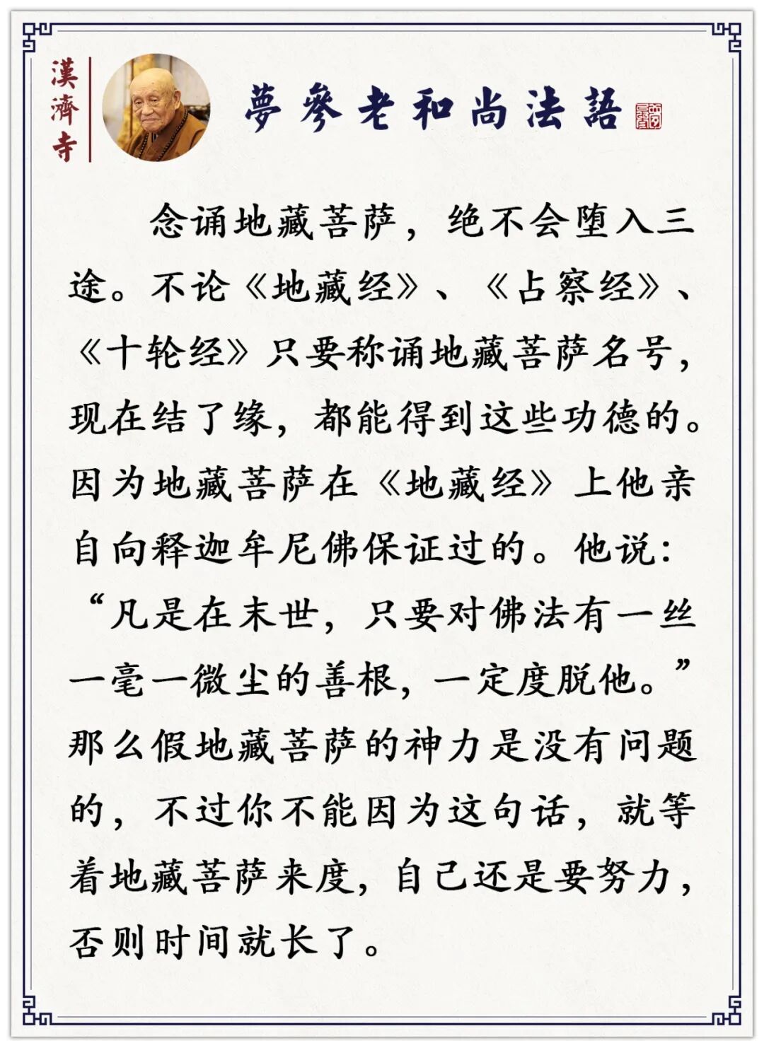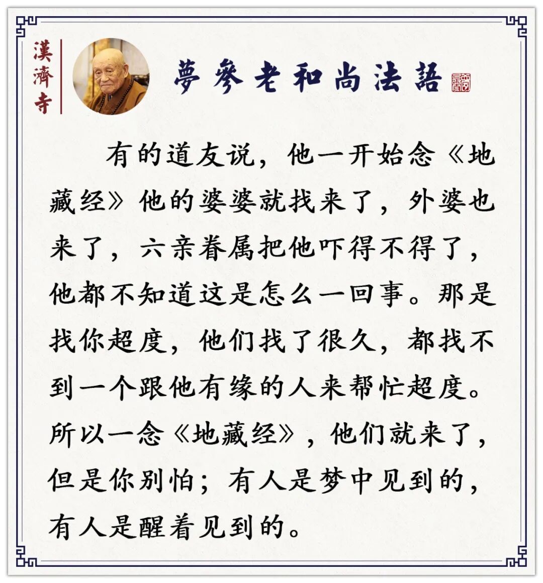 当你梦醒了,你一感觉到,你马上就念地藏圣号,或者念《地藏经》,或者你记到的,或者念《心经》──你会什么念什么。或这些都忘了,就念几句佛号也可以,告诉宿世的骨肉,给他们做方便。