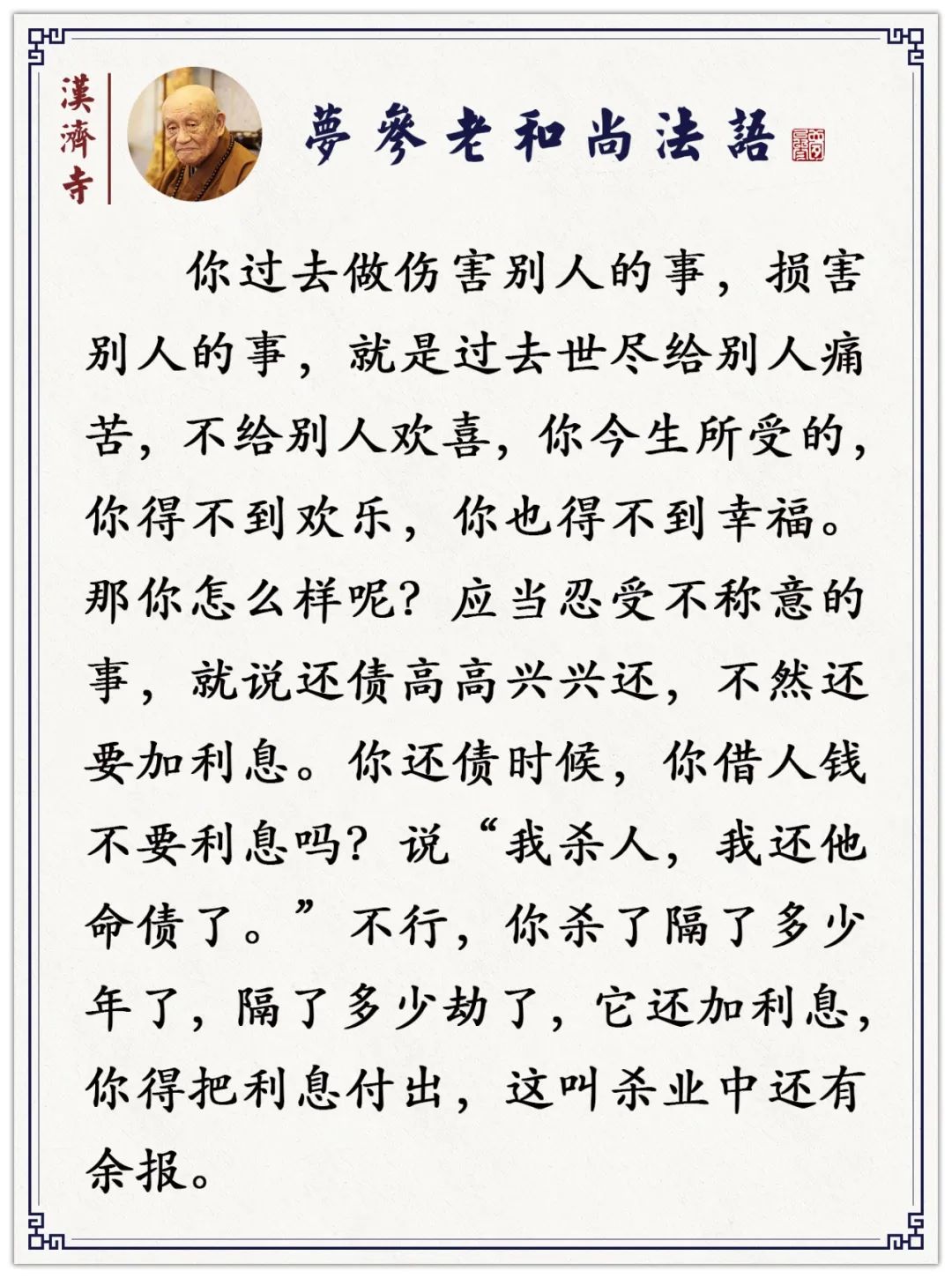 我们要相信因果,现在受的都是因果报应,有什么好抱怨的呢?譬如过去生破坏他人家庭,今生遭人破坏时,就想:好吧,这一切都是自己的业果,正因为自己过去生曾破坏他人,今生才遭此果报,现在欢喜来还,从此彼此互不相欠。假使你在还的过程中,还不断地反驳或反击,虽然老本是还了,但利息又生了不少。无始劫来,生生世世,六亲眷属经常不停地轮转,这其间的因缘说也说不清楚。要到了自己真正明白自己的心、明白他人的心、明白一切众生的心时,才看得清善因恶因。善恶因果业报就是这样来的。佛菩萨加持与否,就看自己是否心诚。至于如何求呢?用一颗诚诚恳恳的心去求。求消业障,业障消失了,福报自然现前。这些道理看似浅显,真正做起来却很深刻。例如同一件事,看他人做起来,觉得轻而易举,不费吹灰之力,等自己真正去做,才知道困难,并不容易。再以叩头为例,叩头很简单,人人都会,若与佛无缘者,你要他在佛前叩头,那可是比什么都难。同样的,信了佛的,对三宝非常恭敬;不信的,就有不同的看法。由此观照我们的烦恼,这一连串心的活动,从受、想、识乃至善恶的心境,你就能明白一半了。知道自己现在所受的,都是自己过去生所做的;现在想解决问题,从今后别再做就好了。不做就不再受,以前的,我今生受了,还了;还了之后不再做,就不再受。再举个例子,譬如我们诵《地藏经》,或观音的经,或《金刚经》,就不再堕入三途,因为我们的心念及所有意识的活动,都没有堕三途的念头。念头没有了,身不行,怎么会再堕入三途呢?有人曾问我:“老法师啊,监狱里头是什么味道?”我回答说:“你想尝一尝吗?想尝的话,你造点罪就去啦!”你一犯罪,警察就来捉你入牢;你没造罪,自然没有进监狱的因。所以《地藏经》第一品,婆罗门女问无毒鬼王:我怎么到地狱来的呢?无毒鬼王说到地狱有两种力量,一是业力,另一种是诸佛的威神力。一切的业都是自己所做,都是自己现前这一念心所起。修行就是把心看好,看看自己一天之中起了多少好念头、起了多少利益他人的念头?又起了多少个坏念头、起了多少害他人的念头?我们的身若是清净,心也清净,这样进佛堂拜佛,都是清清净净的。反之,身不清净,也许多天没沐浴,或几天没换衣服,浑身散发异味,又带了一颗烦恼的心,这样进了佛堂,想求佛菩萨加被、替你解决问题,那是不可能的。这种人最好先解决自己的身心问题,再进佛堂。